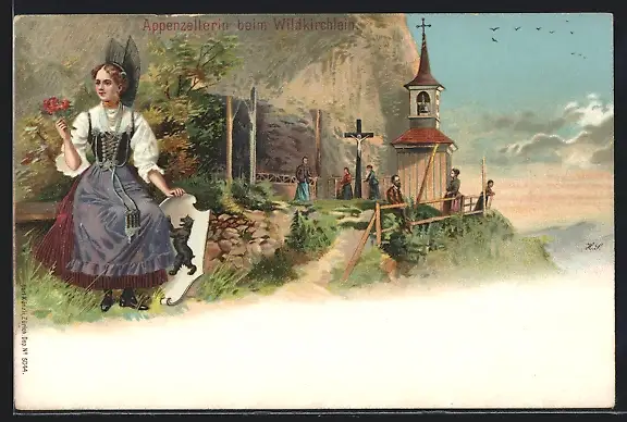 AK Appenzell, Appenzellerin beim Wildkirchlein mit Gläubigen
