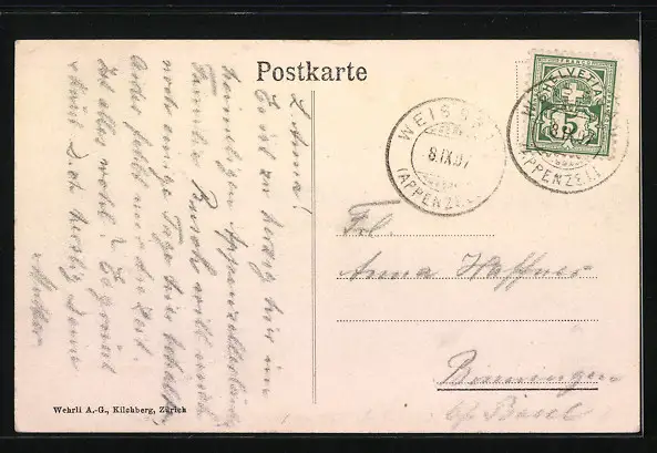 Personenbezogene Daten auf der Rückseite der Karte wurden durch blauen Textmarker unkenntlich gemacht. Die blauen Stellen sind auf die Vorderseite durchgeweicht und wirken sich negativ auf das Postkartenfoto aus