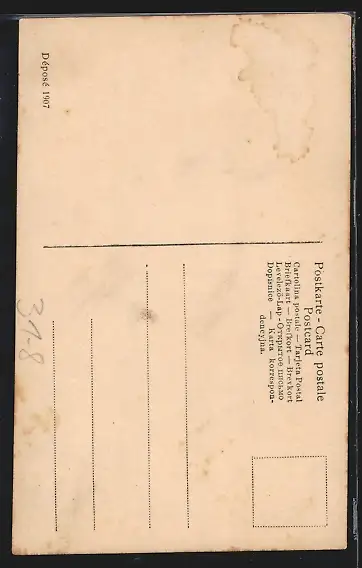 Personenbezogene Daten auf der Rückseite der Karte wurden durch blauen Textmarker unkenntlich gemacht. Die blauen Stellen sind auf die Vorderseite durchgeweicht und wirken sich negativ auf das Postkartenfoto aus