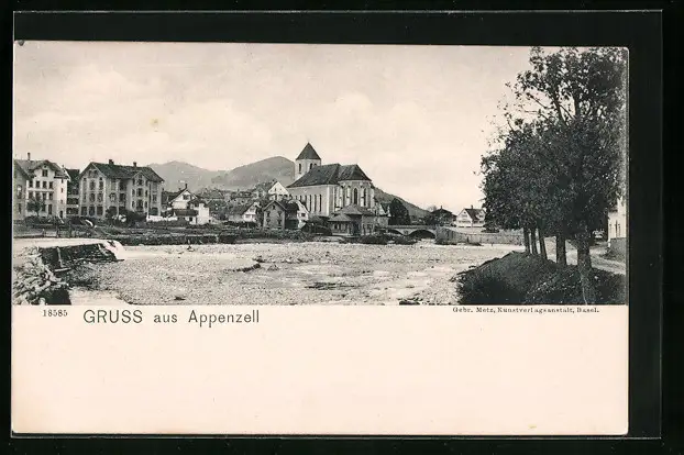 AK Appenzell, Uferpartie mit Kirche und Brücke