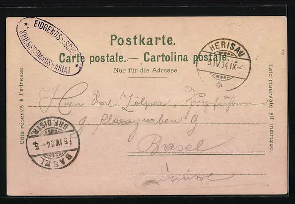 Personenbezogene Daten auf der Rückseite der Karte wurden durch blauen Textmarker unkenntlich gemacht. Die blauen Stellen sind auf die Vorderseite durchgeweicht und wirken sich negativ auf das Postkartenfoto aus