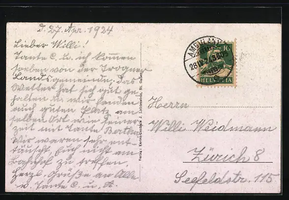 Personenbezogene Daten auf der Rückseite der Karte wurden durch blauen Textmarker unkenntlich gemacht. Die blauen Stellen sind auf die Vorderseite durchgeweicht und wirken sich negativ auf das Postkartenfoto aus
