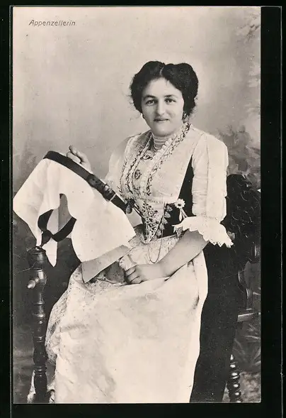 AK Appenzellerin in Tracht mit einem Stickrahmen