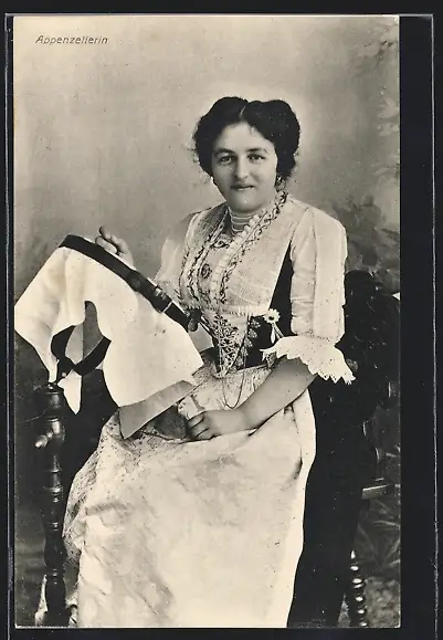 AK Appenzellerin in Tracht mit einem Stickrahmen