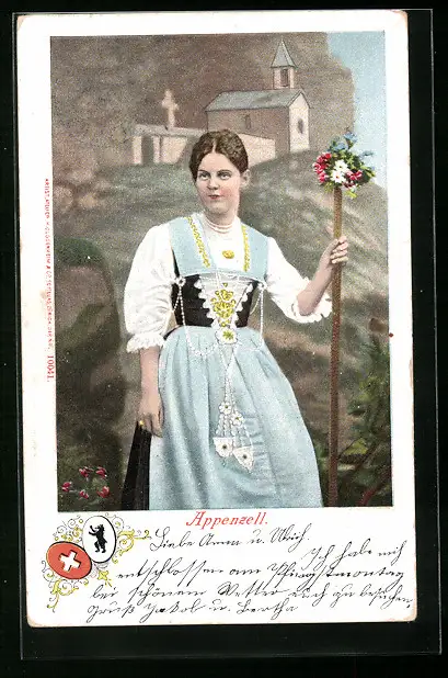 AK Appenzellerin mit Blumenstab vor einer Kirche