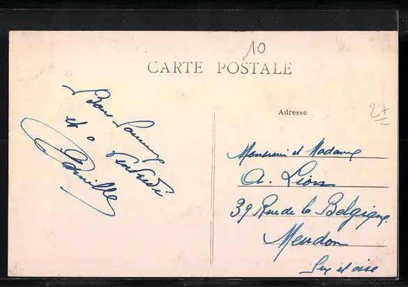 Personenbezogene Daten auf der Rückseite der Karte wurden durch blauen Textmarker unkenntlich gemacht. Die blauen Stellen sind auf die Vorderseite durchgeweicht und wirken sich negativ auf das Postkartenfoto aus