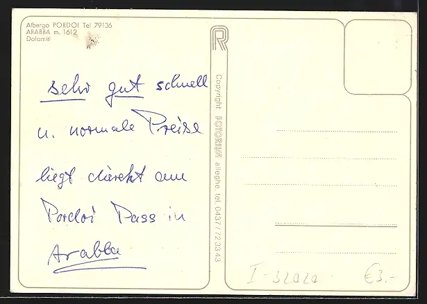 Personenbezogene Daten auf der Rückseite der Karte wurden durch blauen Textmarker unkenntlich gemacht. Die blauen Stellen sind auf die Vorderseite durchgeweicht und wirken sich negativ auf das Postkartenfoto aus
