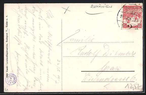 Personenbezogene Daten auf der Rückseite der Karte wurden durch blauen Textmarker unkenntlich gemacht. Die blauen Stellen sind auf die Vorderseite durchgeweicht und wirken sich negativ auf das Postkartenfoto aus