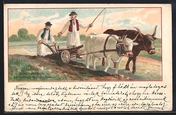 AK Arbeit am Felde, Rindergespann als Pflug