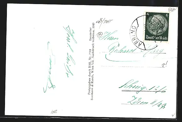 Personenbezogene Daten auf der Rückseite der Karte wurden durch blauen Textmarker unkenntlich gemacht. Die blauen Stellen sind auf die Vorderseite durchgeweicht und wirken sich negativ auf das Postkartenfoto aus