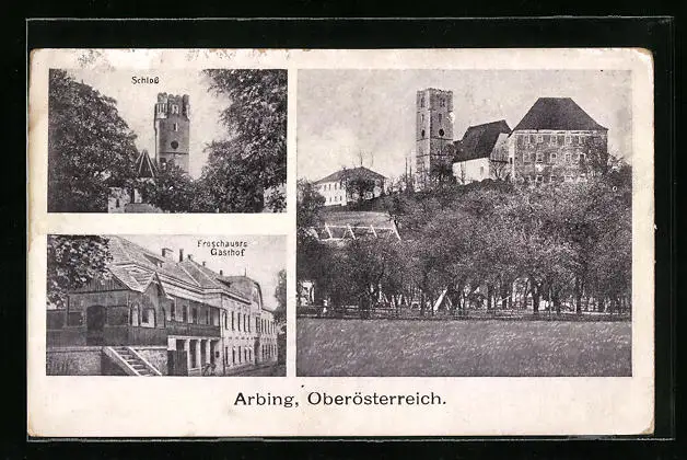 AK Arbing, Ortsansicht mit Schloss, Froschauers Gasthof
