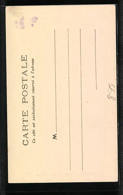 Personenbezogene Daten auf der Rückseite der Karte wurden durch blauen Textmarker unkenntlich gemacht. Die blauen Stellen sind auf die Vorderseite durchgeweicht und wirken sich negativ auf das Postkartenfoto aus