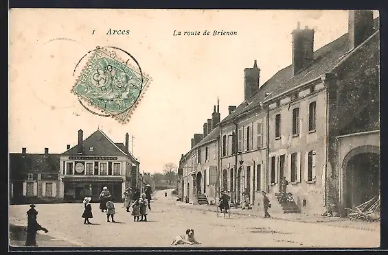 AK Arces, La route de Brienon avec des passants et un chien sur la place