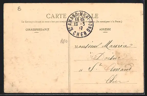 Personenbezogene Daten auf der Rückseite der Karte wurden durch blauen Textmarker unkenntlich gemacht. Die blauen Stellen sind auf die Vorderseite durchgeweicht und wirken sich negativ auf das Postkartenfoto aus