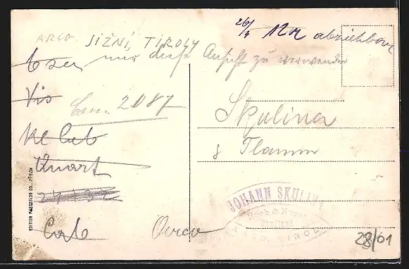 Personenbezogene Daten auf der Rückseite der Karte wurden durch blauen Textmarker unkenntlich gemacht. Die blauen Stellen sind auf die Vorderseite durchgeweicht und wirken sich negativ auf das Postkartenfoto aus