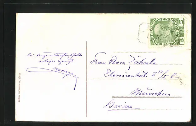 Personenbezogene Daten auf der Rückseite der Karte wurden durch blauen Textmarker unkenntlich gemacht. Die blauen Stellen sind auf die Vorderseite durchgeweicht und wirken sich negativ auf das Postkartenfoto aus