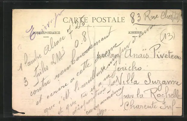 Personenbezogene Daten auf der Rückseite der Karte wurden durch blauen Textmarker unkenntlich gemacht. Die blauen Stellen sind auf die Vorderseite durchgeweicht und wirken sich negativ auf das Postkartenfoto aus