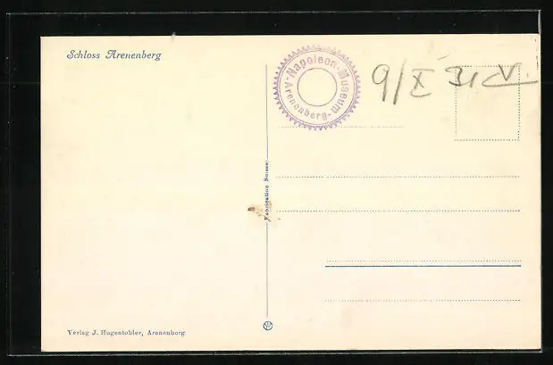 Personenbezogene Daten auf der Rückseite der Karte wurden durch blauen Textmarker unkenntlich gemacht. Die blauen Stellen sind auf die Vorderseite durchgeweicht und wirken sich negativ auf das Postkartenfoto aus