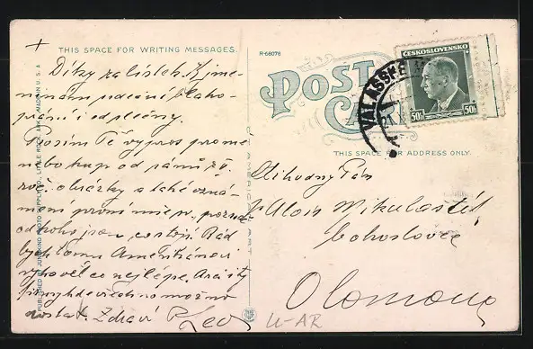 Personenbezogene Daten auf der Rückseite der Karte wurden durch blauen Textmarker unkenntlich gemacht. Die blauen Stellen sind auf die Vorderseite durchgeweicht und wirken sich negativ auf das Postkartenfoto aus