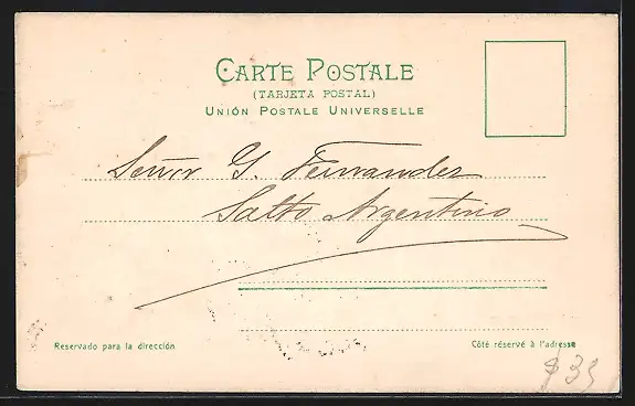 Personenbezogene Daten auf der Rückseite der Karte wurden durch blauen Textmarker unkenntlich gemacht. Die blauen Stellen sind auf die Vorderseite durchgeweicht und wirken sich negativ auf das Postkartenfoto aus