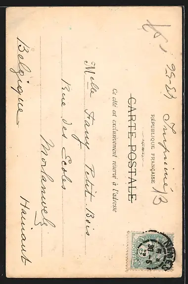Personenbezogene Daten auf der Rückseite der Karte wurden durch blauen Textmarker unkenntlich gemacht. Die blauen Stellen sind auf die Vorderseite durchgeweicht und wirken sich negativ auf das Postkartenfoto aus