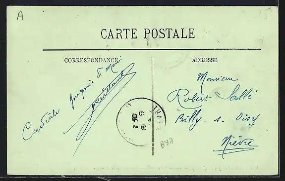Personenbezogene Daten auf der Rückseite der Karte wurden durch blauen Textmarker unkenntlich gemacht. Die blauen Stellen sind auf die Vorderseite durchgeweicht und wirken sich negativ auf das Postkartenfoto aus