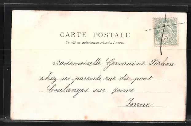Personenbezogene Daten auf der Rückseite der Karte wurden durch blauen Textmarker unkenntlich gemacht. Die blauen Stellen sind auf die Vorderseite durchgeweicht und wirken sich negativ auf das Postkartenfoto aus