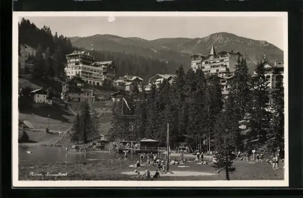 AK Arosa, Strandbad mit Blick auf Gebäude