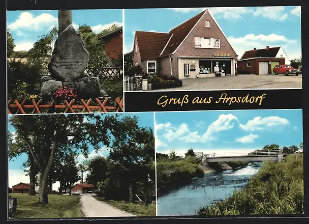 AK Arpsdorf, Gedenkstein, Edeka Geschäft, Brücke an einer Wasserpartie