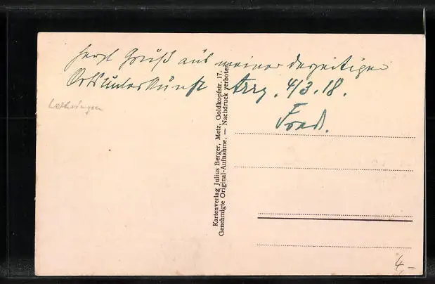 Personenbezogene Daten auf der Rückseite der Karte wurden durch blauen Textmarker unkenntlich gemacht. Die blauen Stellen sind auf die Vorderseite durchgeweicht und wirken sich negativ auf das Postkartenfoto aus