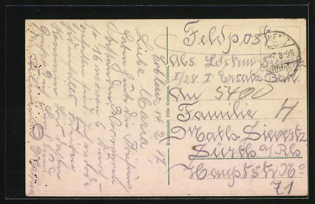Personenbezogene Daten auf der Rückseite der Karte wurden durch blauen Textmarker unkenntlich gemacht. Die blauen Stellen sind auf die Vorderseite durchgeweicht und wirken sich negativ auf das Postkartenfoto aus