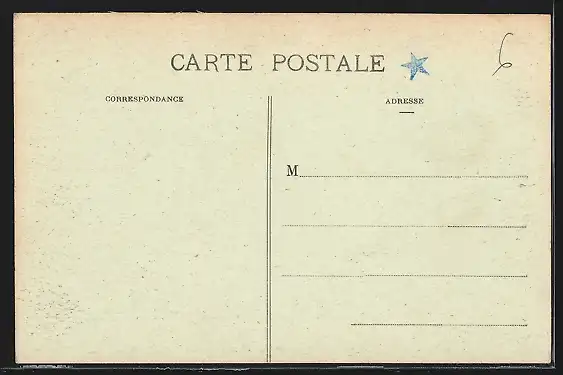 Personenbezogene Daten auf der Rückseite der Karte wurden durch blauen Textmarker unkenntlich gemacht. Die blauen Stellen sind auf die Vorderseite durchgeweicht und wirken sich negativ auf das Postkartenfoto aus