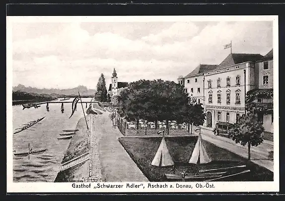 AK Aschach a. Donau, Uferpartie mit Gasthof Schwarzer Adler