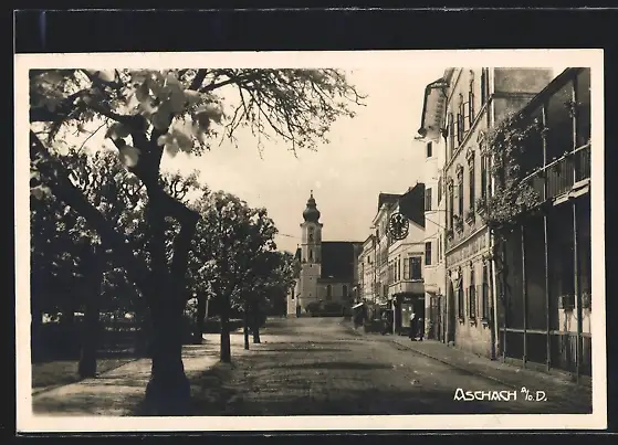 AK Aschach a. d. D., Strassenpartie mit Blick zur Kirche