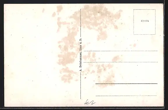 Personenbezogene Daten auf der Rückseite der Karte wurden durch blauen Textmarker unkenntlich gemacht. Die blauen Stellen sind auf die Vorderseite durchgeweicht und wirken sich negativ auf das Postkartenfoto aus