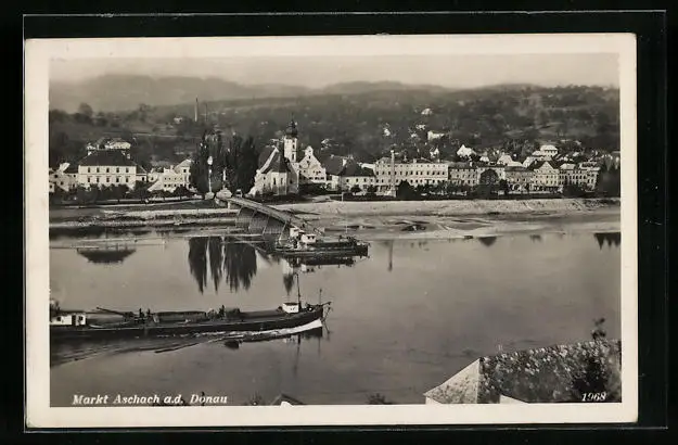 AK Aschach a. d. Donau, Uferpartie mit Kirche und Booten
