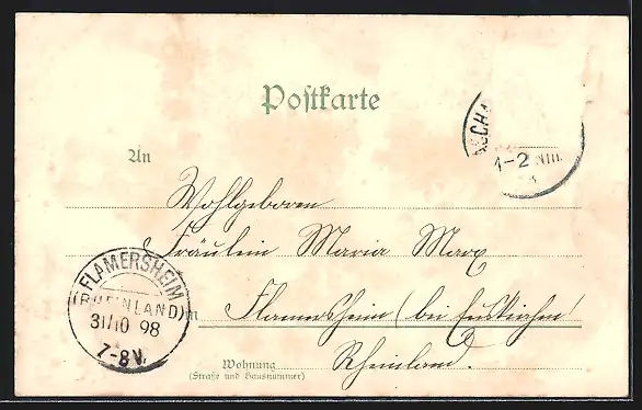 alte Ansichtskarte, gelaufen 1898, Briefmarke entfernt, rückseitig Oberflächenschaden, guter Zustand