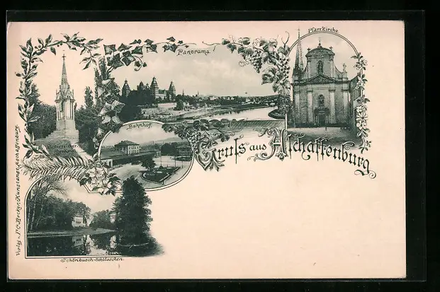 AK Aschaffenburg, Pfarrkirche, Bahnhof, Schönbusch-Schlösschen