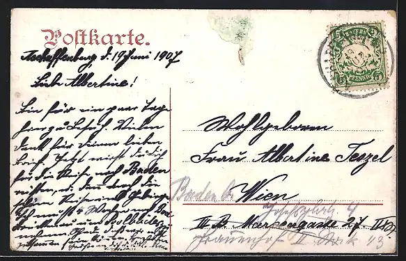 alte Ansichtskarte, gelaufen 1907, rückseitig Oberflächenschaden, Stempelspur, guter Zustand