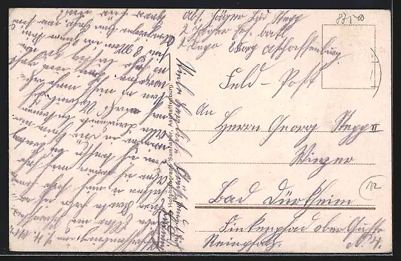 Personenbezogene Daten auf der Rückseite der Karte wurden durch blauen Textmarker unkenntlich gemacht. Die blauen Stellen sind auf die Vorderseite durchgeweicht und wirken sich negativ auf das Postkartenfoto aus
