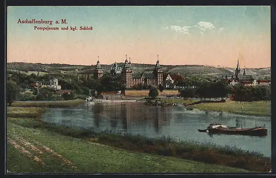 AK Aschaffenburg a. M., Pompejanum und kgl. Schloss mit Boot