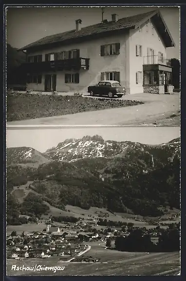 AK Aschau /Chiemgau, Haus mit Auto, Ortsansicht aus der Vogelschau