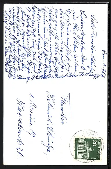 Personenbezogene Daten auf der Rückseite der Karte wurden durch blauen Textmarker unkenntlich gemacht. Die blauen Stellen sind auf die Vorderseite durchgeweicht und wirken sich negativ auf das Postkartenfoto aus