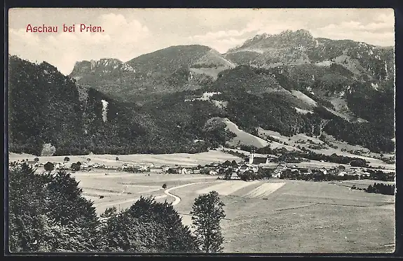 AK Aschau /Prien, Ortsansicht mit Berg dahinter