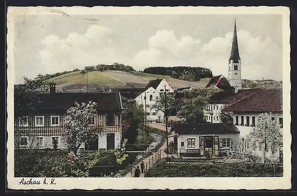 AK Aschau am Inn, Teilansicht mit Kirche und Umgebung