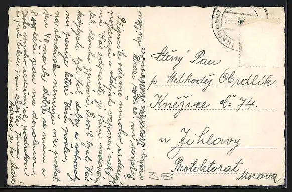Personenbezogene Daten auf der Rückseite der Karte wurden durch blauen Textmarker unkenntlich gemacht. Die blauen Stellen sind auf die Vorderseite durchgeweicht und wirken sich negativ auf das Postkartenfoto aus
