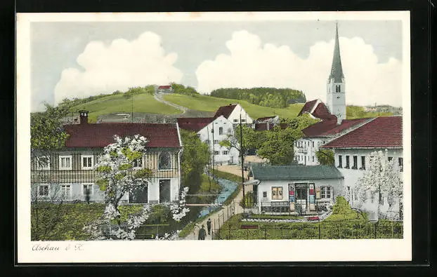 AK Aschau b. K., Teilansicht mit Kirche im Frühling