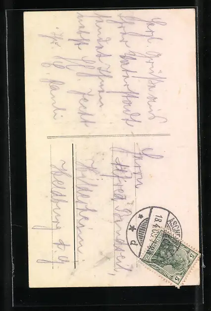 Personenbezogene Daten auf der Rückseite der Karte wurden durch blauen Textmarker unkenntlich gemacht. Die blauen Stellen sind auf die Vorderseite durchgeweicht und wirken sich negativ auf das Postkartenfoto aus