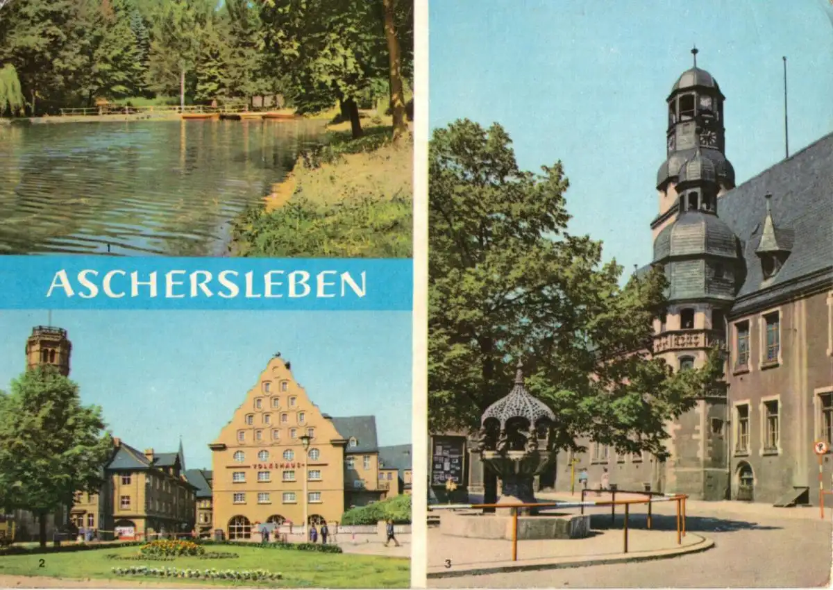 AnsichtskarteAscherslebendrei Abb. - Gondelteich, Volkshaus und Post, RathausErhaltung I-II, Beförderungsspuren