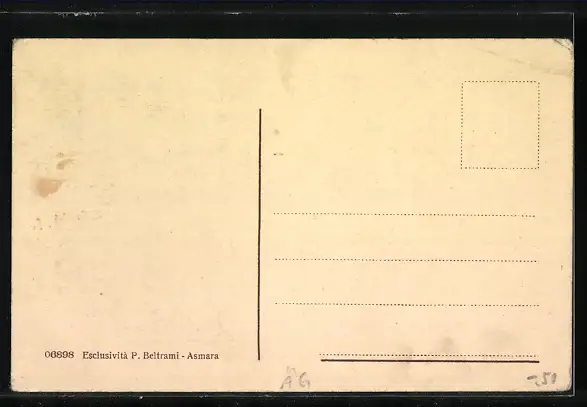 Personenbezogene Daten auf der Rückseite der Karte wurden durch blauen Textmarker unkenntlich gemacht. Die blauen Stellen sind auf die Vorderseite durchgeweicht und wirken sich negativ auf das Postkartenfoto aus